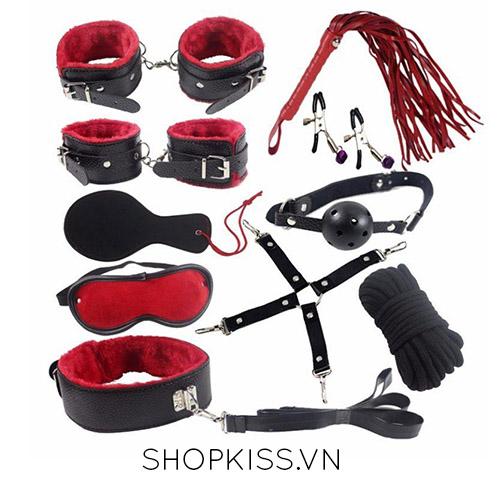 Bộ đồ chơi gồm 10 món: Bịt mắt cũ , khóa cổ nhận xét , dây khóa tay chân bảng giá , còng tay địa chỉ , còng chân xuất xứ , roi da tại nhà , phết mông bảng giá , kẹp ngực theo yêu cầu , khóa hàm xách tay , dây trói.